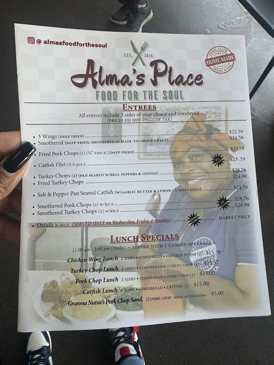 At Alma's Place, every dish is a celebration of traditional flavors that have been passed down through generations. The menu is lovingly crafted and showcases a plethora of mouthwatering sides including potato salad, macaroni & cheese, yams, collard greens, and creamy cornbread muffins. Patrons rave about their famous fried catfish which pairs harmoniously with generous servings of red beans & rice. Each plate is designed to satisfy, featuring ample portions that leave you yearning for just one more bite.