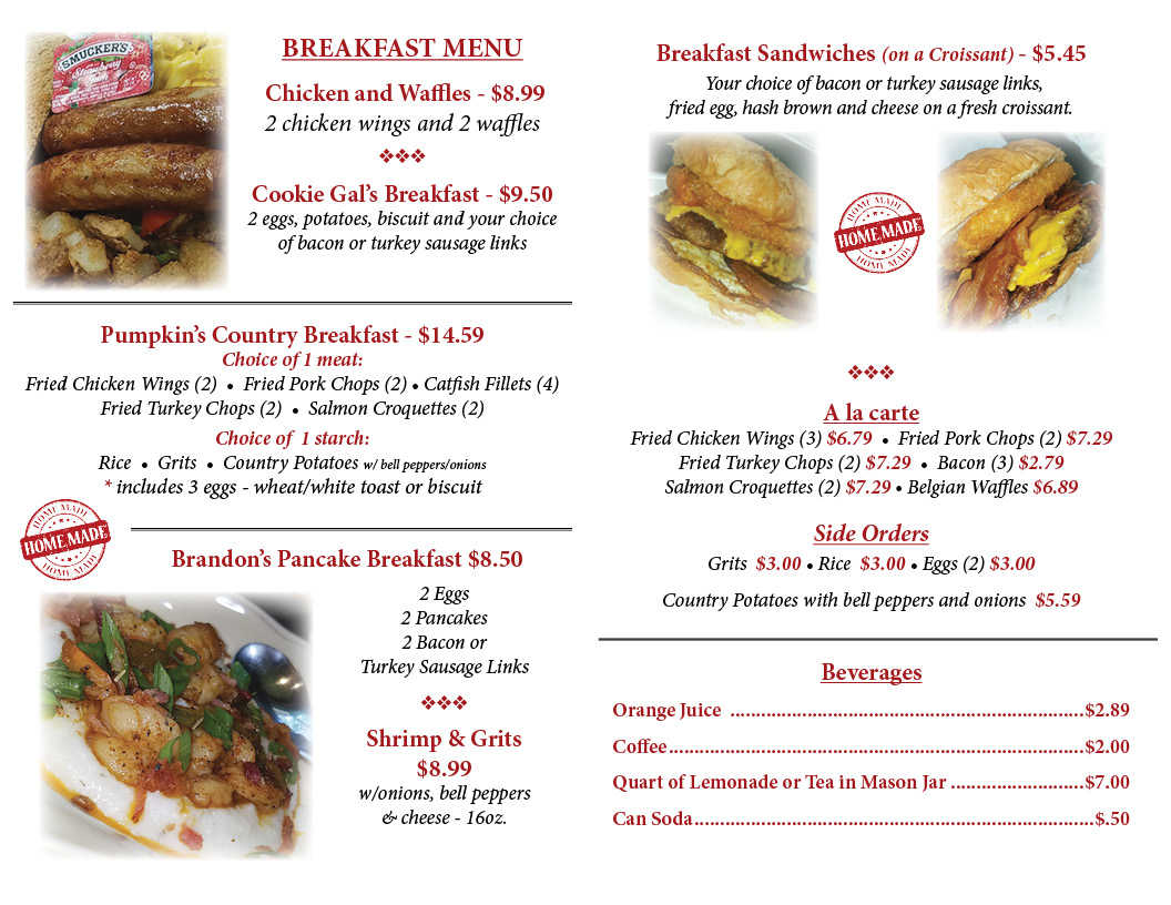 Start your day with a scrumptious breakfast—a favorite is the Chicken and Waffles, where crispy chicken wings snuggle perfectly between fluffy waffles for only $8.99. Or try the Cookie Gal’s Breakfast for a delightful combination of eggs, potatoes, and a biscuit, complemented by your choice of bacon or turkey sausage. It's a meal that will leave you fueled and ready to take on whatever comes next!